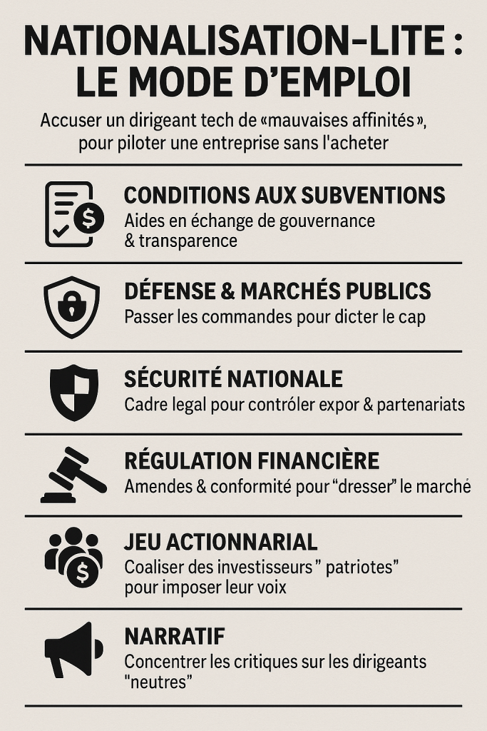 L’angle “McCarthy mon amour” explique la grammaire du moment : transformer la peur de l’ennemi intérieur en tuyauterie juridique-financière qui arrime un champion national — sans prononcer le mot interdit : nationalisation.